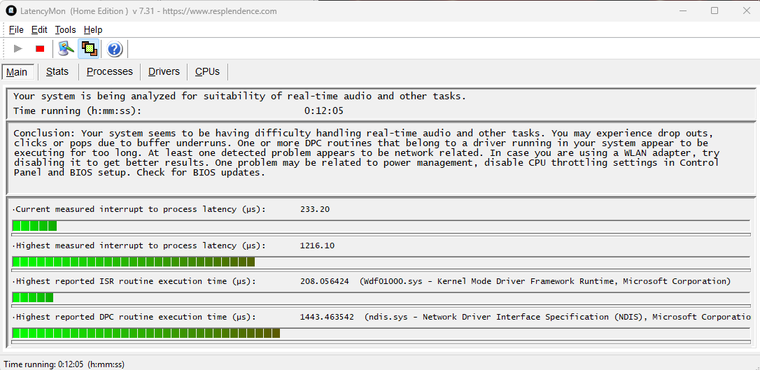 Back to the DPC latency. After a recent Windows update, I noticed crazy DPC latency to the point that my DAW seemed to be useless for a few days. I was suddenly getting crackles and dropouts that made using Reaper unbearable. At some point, that egregious subsided a bit but I can still hear intermittent crackling and LatencyMon doesn’t look great: